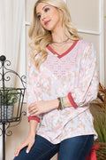 Introducing the Celeste Full Size Leaf Print Contrast Trim Balloon Sleeve Top—your new wardrobe essential! This beautiful V-neck top features a faded multicolored leaf print that evokes a serene and peaceful vibe, making it perfect for any occasion.